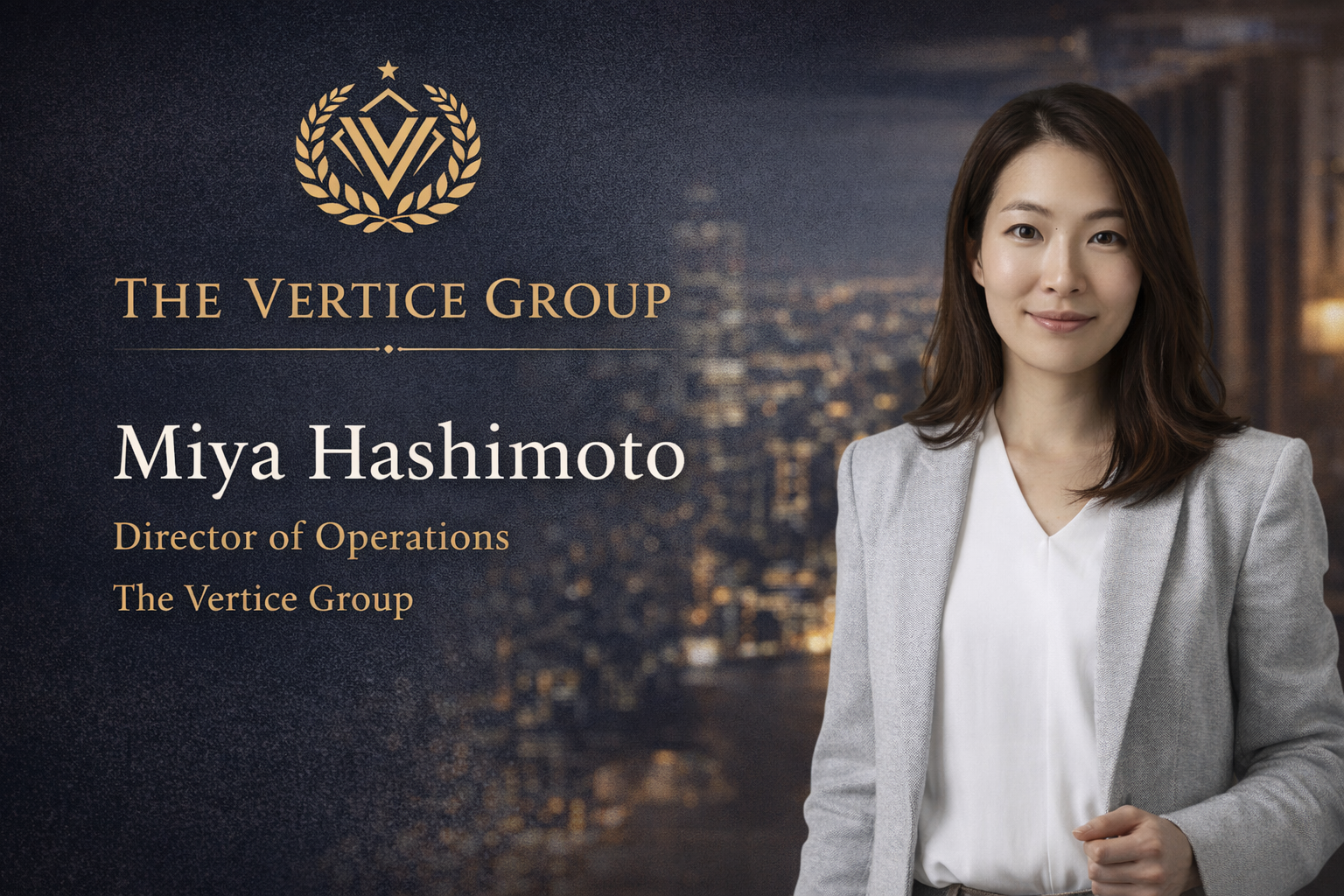 Vertice Group創設者であるScott Perryは次のように述べています。「ミヤは、現段階の当社に必要不可欠なバイリンガルによる構造力、明確性、そして実行力を兼ね備えています。複数の業界および国際市場において事業を拡大していく中で、彼女の存在は組織全体の精度と一貫性を高める重要な役割を担います。」橋本は経営陣および各事業責任者と密接に連携し、コミュニケーションの最適化、組織内の責任明確化、ならびに現在および将来の事業成長を支える運営基盤の構築に貢献していきます。